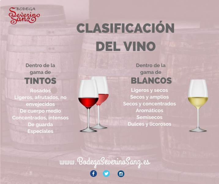 La enología tienen una gran variedad de tipos de vinos, si los clasificamos según su color. Dentro de la gama de Tintos, estarían los rosados, ligeros, afrutados… y dentro de la gama de blancos estarían los ligeros y secos, semisecos, dulces y licorosos…