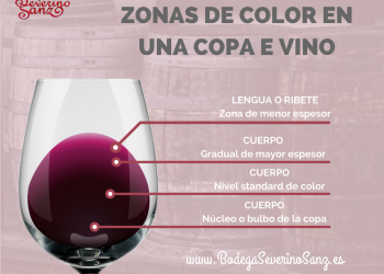 El primer paso a la hora de una cata de vino es la vista, mediante la cual observamos el aspecto y los colores que tiene. Estas son las zonas de colo…